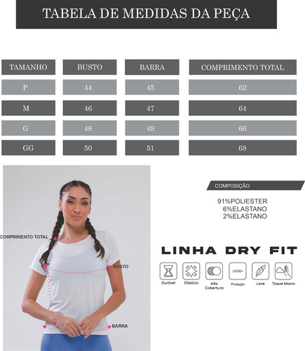 Esta Blusa possui Micro furos que proporcionam ainda mais respirabilidade, que auxiliam da regulação da temperatura corporal.